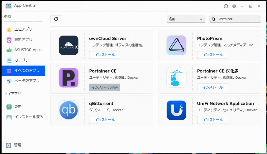 App CentralでPortainerと検索するとPortainer CEが出てくるのでインストールする